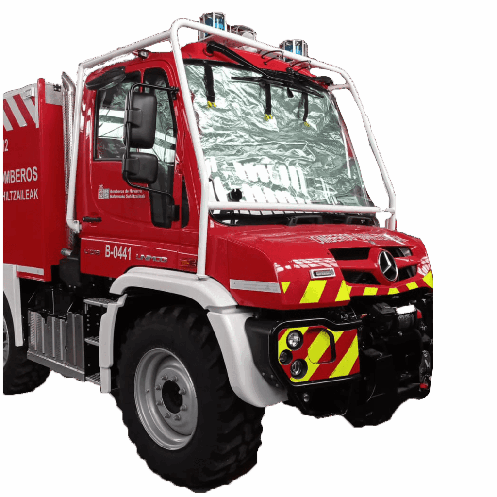 El Kit de Cortinas Ignífugas de Cabina FS5 está formado por 4 o 6 cortinas ignífugas, enrollables y unibles entre sí mediante solapas con velcro, fabricadas con materiales ignífugos para la protección del interior de la cabina del camión de bomberos y maquinaria pesada frente al calor convectivo y radiante de la llama.